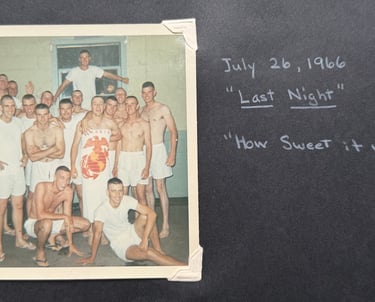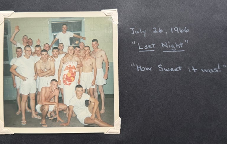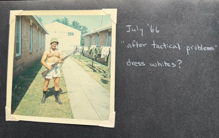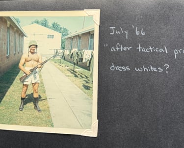 With over 43 recorded interviews both in per person and via phone, I am working through the transcripts, consolidating, checking for historical accuracy, and editing. The interviews cover stories of his father's exploits in the 1st Raider Battalion, growing up in a Marine family, preparation for Service, Butch's experiences in Vietnam and some stateside stories after the war. The photos displayed here are from Butch's old photo album when he was in Platoon Leadership School and Officer Training School.